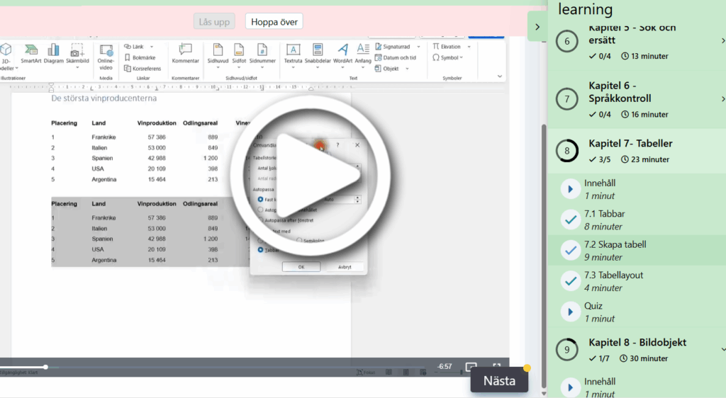 Kursen tar upp språkkontroll, rättstavning och autokorrigering. Dessutom lär du dig skapa tabeller och lägga till visuella element som bilder, former, SmartArt och spalter.